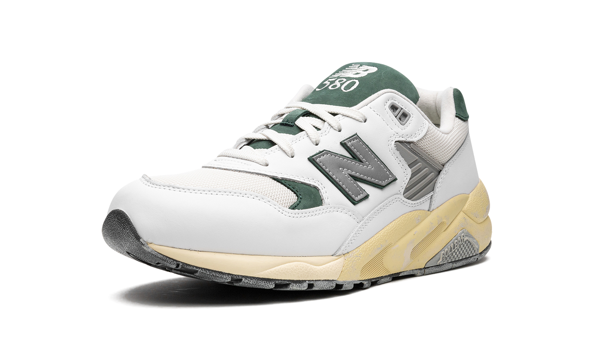 The New Balance 580 “Nightwatch Green” is a colorway of the classic shoe with a decidedly vintage vibe. This version of the New Balance 580 features a white mesh base with white leather overlays. A contrasting grey “N” logo appears on the mid-panel. Classic “NB 580” detailing is embroidered on the Nightwatch-Green-colored suede tongue. Black “New Balance” branding is stitched onto the green heel overlay. Underfoot, the shoe takes on a throwback-inspired vibe with an intentionally aged Rollbar-cushioned midsole.