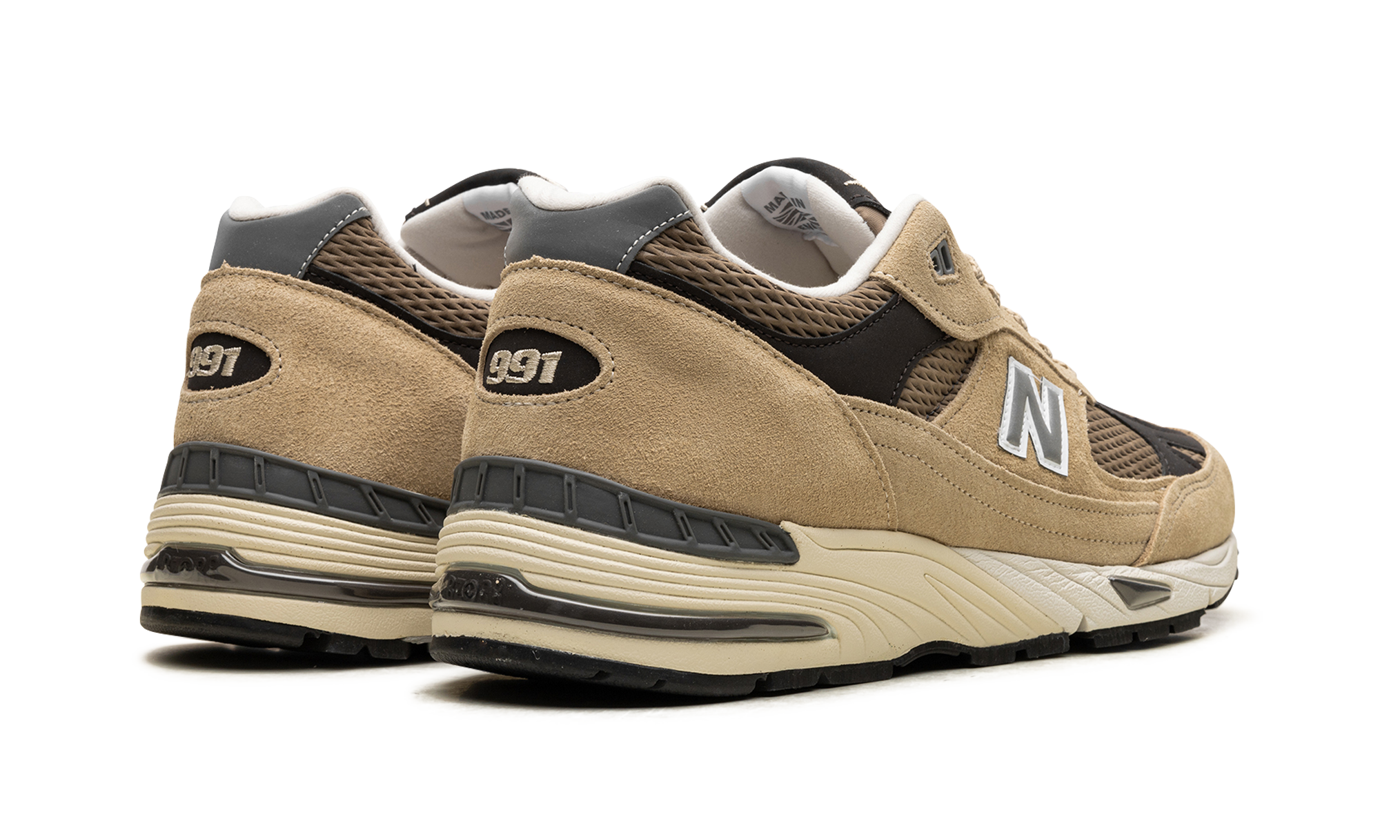 The New Balance 991v2 "Finale Pack - Pale Khaki" is a tan-based colorway of the retro shoe. One of two colorways from the “Finale Pack,” the New Balance 991v2 “Pale Khaki” features a brown mesh base contrasted with Pale Khaki-colored premium suede overlays. A reflective grey “N” logo can be found on either side of the shoe, while “991” branding appears on the heel. Additionally, a “New Balance 991” detail is embroidered on the tongue in brown lettering. Underfoot, FuelCell cushioning provides all-day comfort.