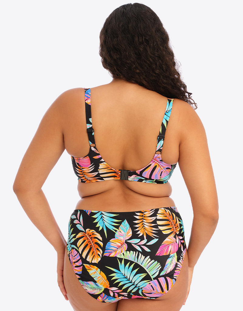 Soak up the sun with Elomi's Tropical Falls plunge bikini top, showcasing a bold tropical leaf print on black. This bra-sized bikini top offers the same fit, comfort and support as your favourite bra, but in swimwear form so you can sunbathe, swim and splash without a worry! The lightweight mesh lining adds support and maintains shape even wet, with powernet lining in the wings to stay securely in place.