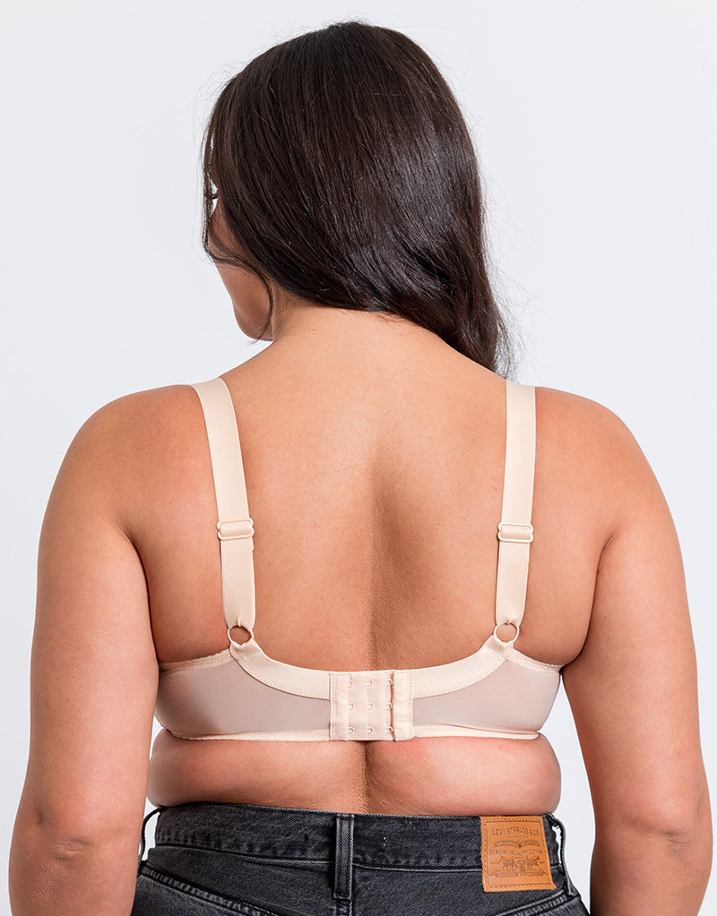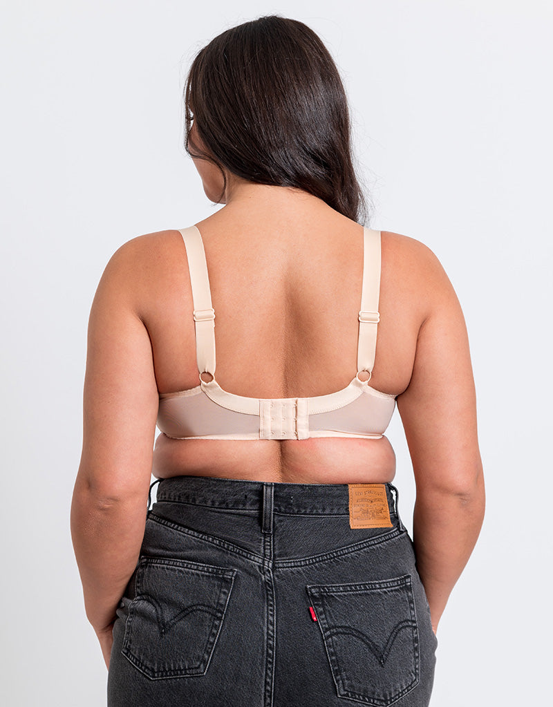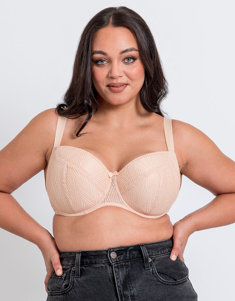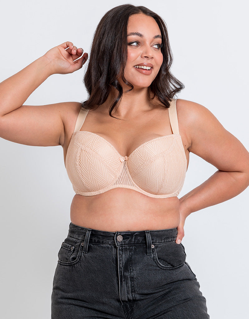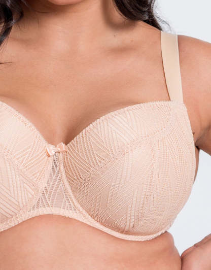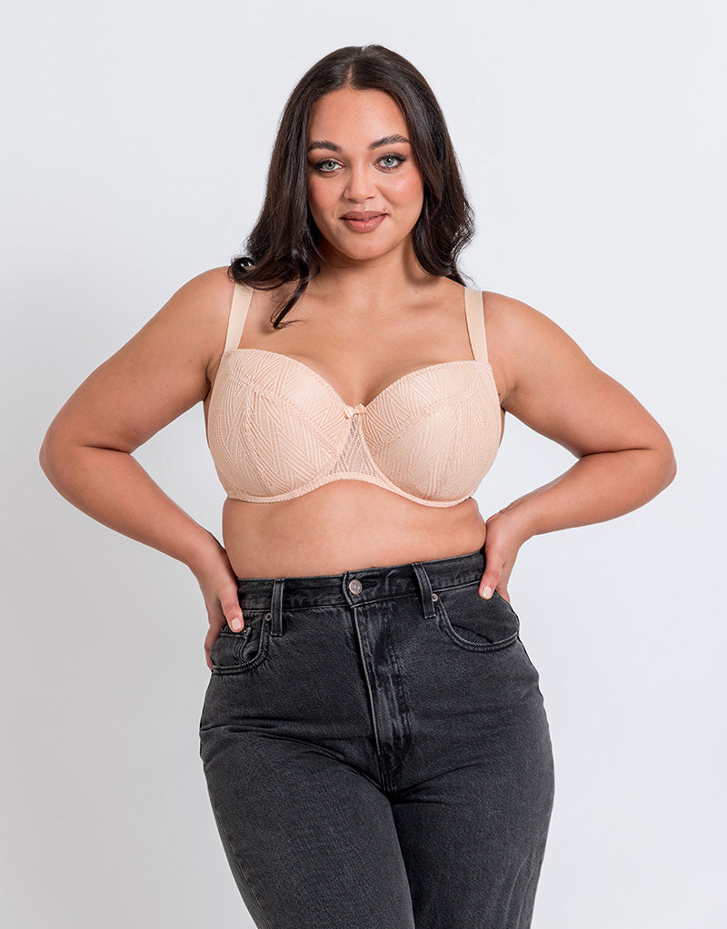 Flirtelle's Esme bra is a staple style for any fuller bust wardrobe! The foam lined, 3-part cups are designed to lift and define your bust without adding extra volume, styled with a cool zig-zag mesh overlay in a latte tone. It's comfortable and sophisticated, perfect for everyday.