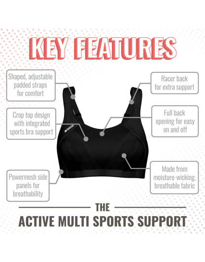 The Shock Absorber Multi Sports bra is award winning and designed to give maximum support for high impact activities. Made from breathable and moisture-wicking sports fabric to keep you cool and comfortable, with a wire-free design. Inner seams and panels work to hold your bust securely in place, while lightly cushioned shoulder straps and unique double hook-and-eye fastening helps to disperse pressure.