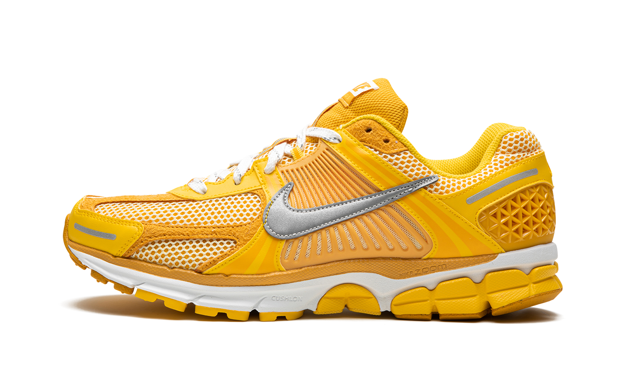 The Nike Zoom Vomero 5 “Varsity Maize” is a head-turning yellow colorway of the classic performance shoe that was originally released in 2010. The Zoom Vomero 5 was re-introduced as a lifestyle shoe via a collaboration with Samuel Ross’s *A COLD WALL clothing brand in 2018, and again beginning in 2022 thanks to colorways like the “Varsity Maize.” The upper features a white mesh construction in Laser Orange with Varsity Maize overlays throughout the design. A Metallic Silver leather Swoosh appears on both sides of the shoe. “Nike Vomero 5” branding is found on the tongue. The shoe features Zoom Air cushioning within its foam midsole for all-day comfort. Varsity Maize
